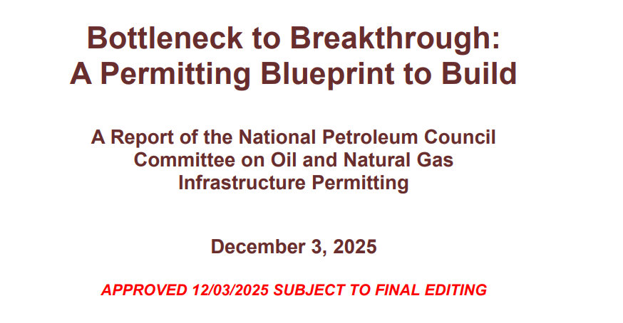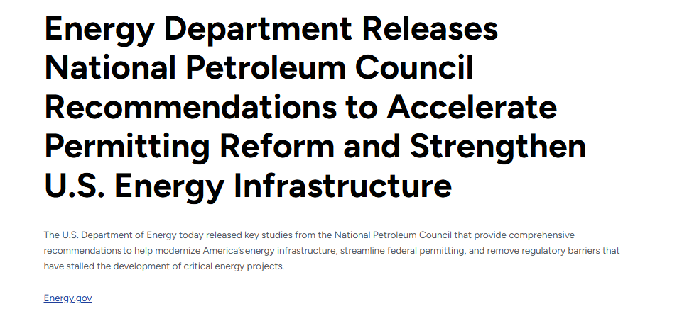The DOE released two major studies authored by National Petroleum Council. The purpose: to modernize U.S. energy infrastructure, speed up federal permitting, and remove regulatory barriers that have delayed important energy and natural gas projects.